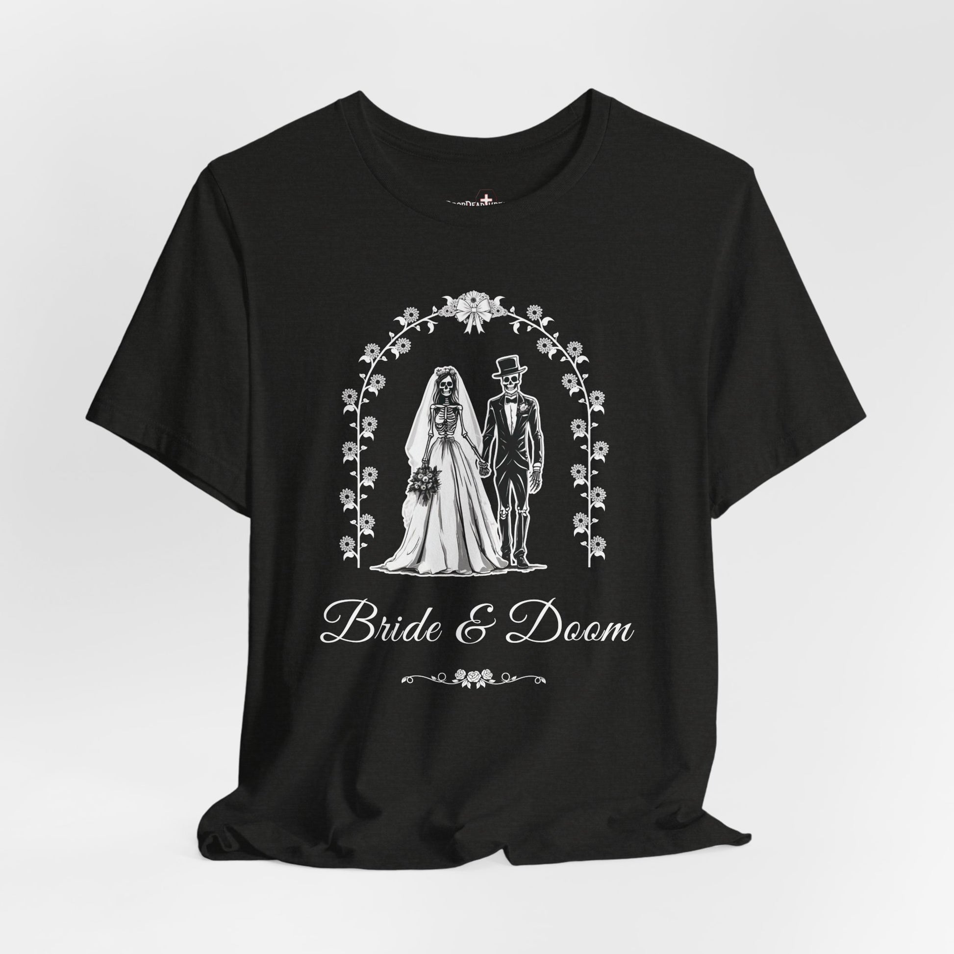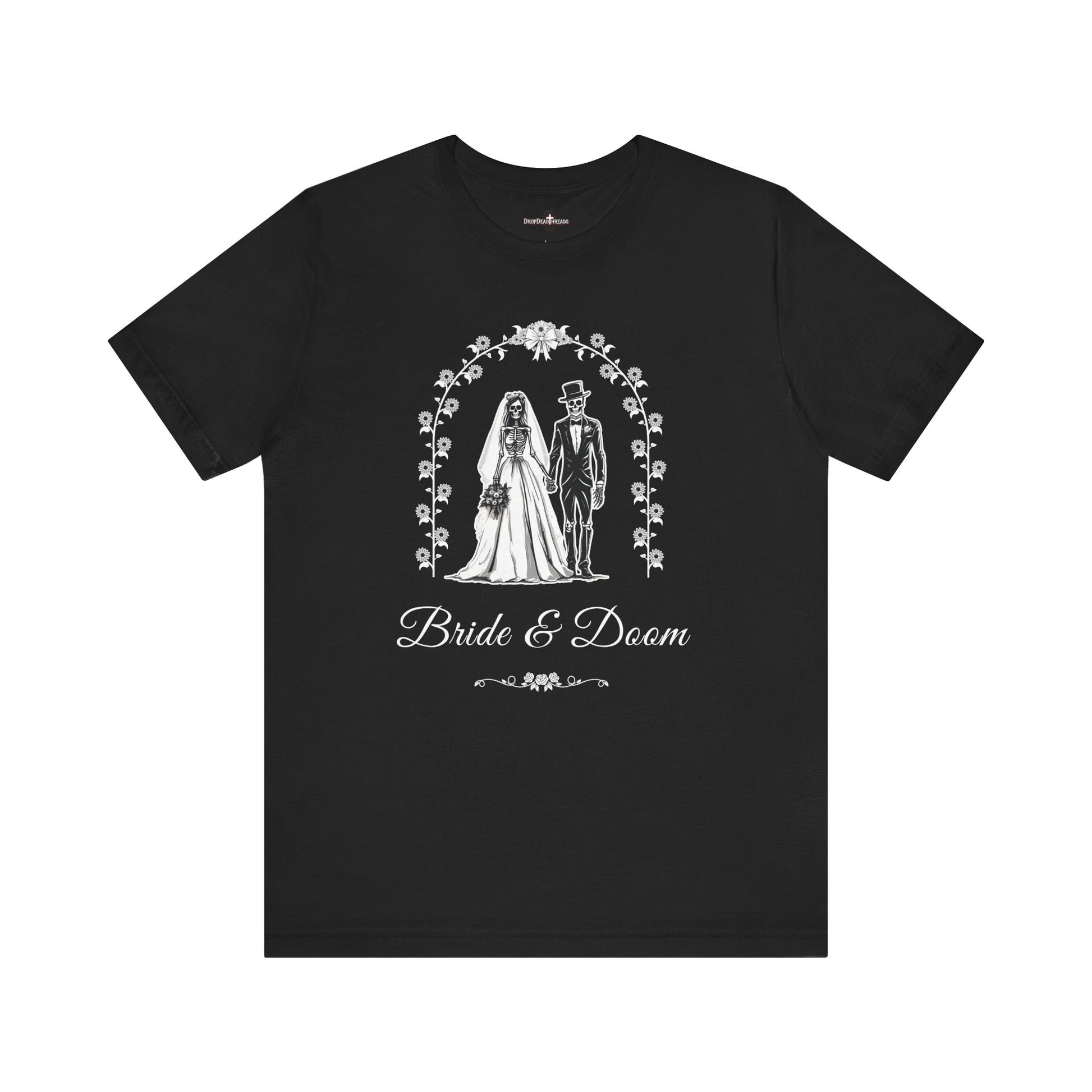 "Bride & Doom" featuring a skeletal wedding couple beneath a wedding arbor made with daisies and vines and topped with a floral daisy swag and pretty silk bow. How romantic.