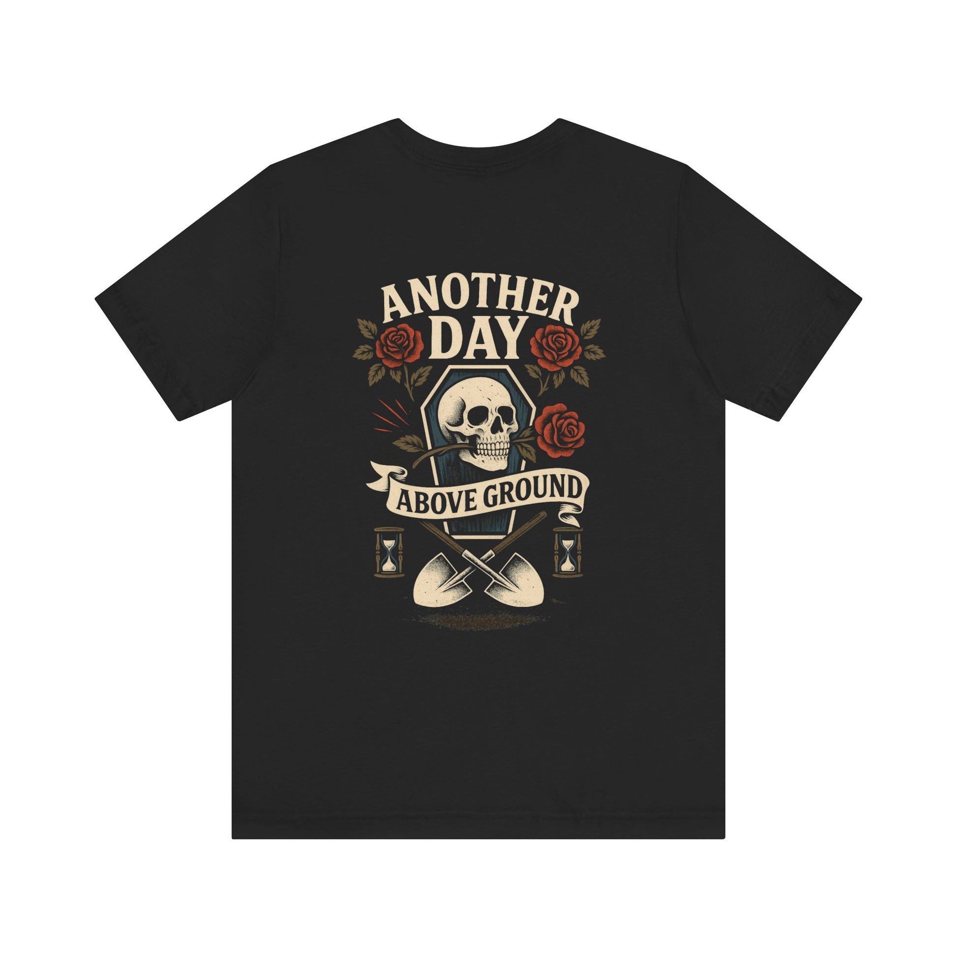 Every day above ground is a good one — or at least, better than the alternative. Life’s short, death’s eternal — might as well dress for the occasion. “Another Day Above Ground” keeps things lighthearted while digging deep into your dark sense of humor.