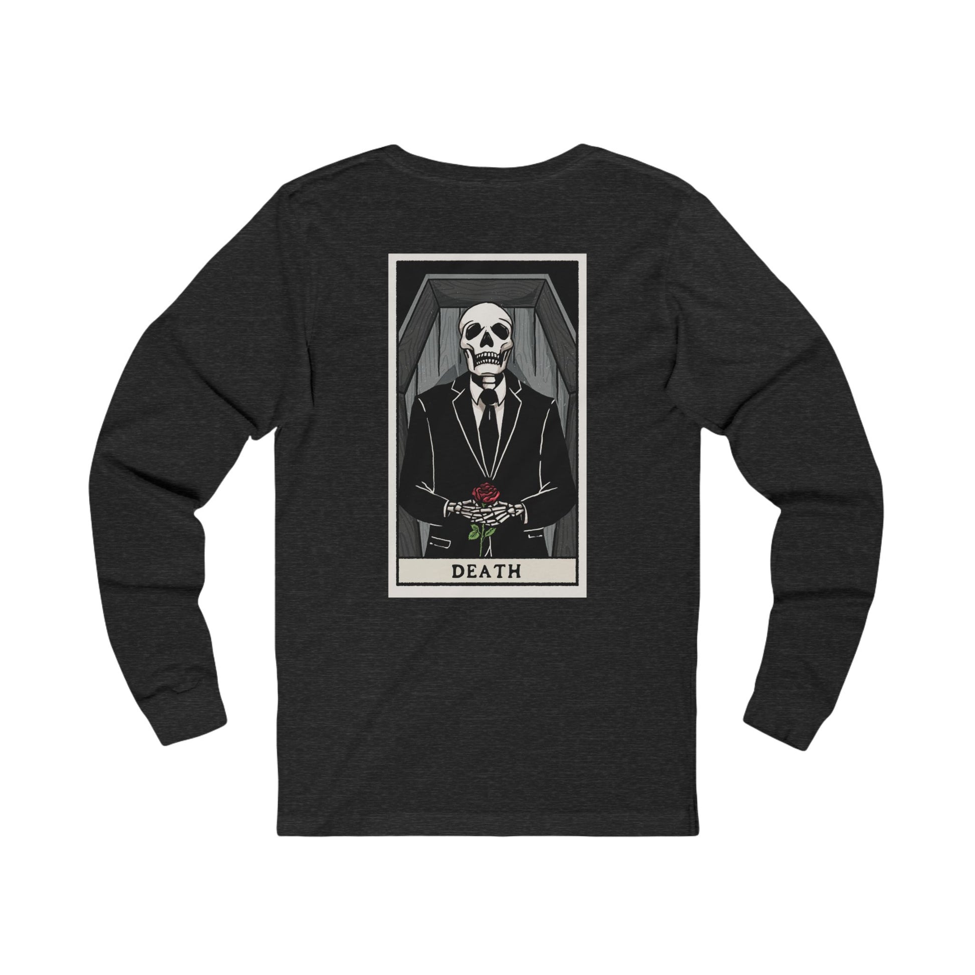 Get this one of a kind long sleeve t-shirt in our Tarot Card series. "DEATH" featuring a well dressed man laid to rest in a coffin, holding a single red rose.