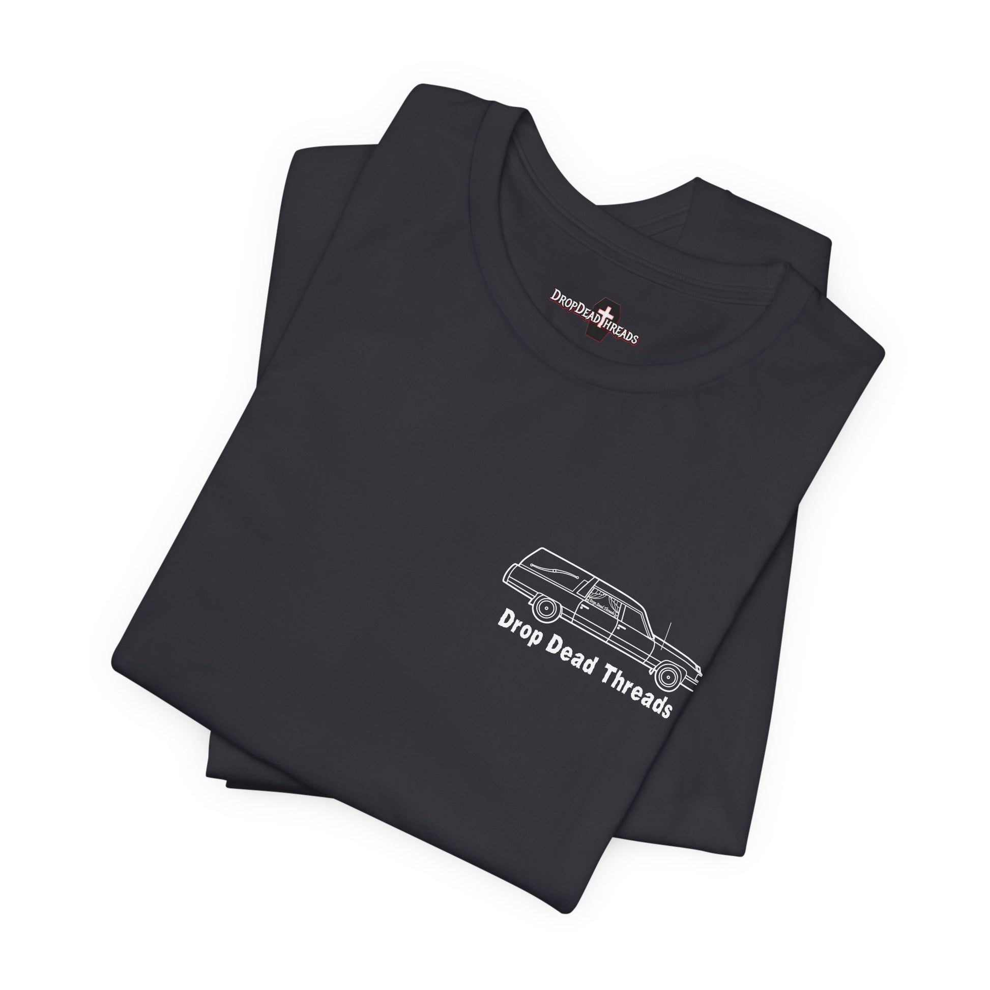 This is our original "Last Responder" Design featuring a hearse icon-style illustration of our 1991 Cadillac Superior Crown Sovereign Hearse on the backside of the shirt and a smaller hearse on the front with our logo.