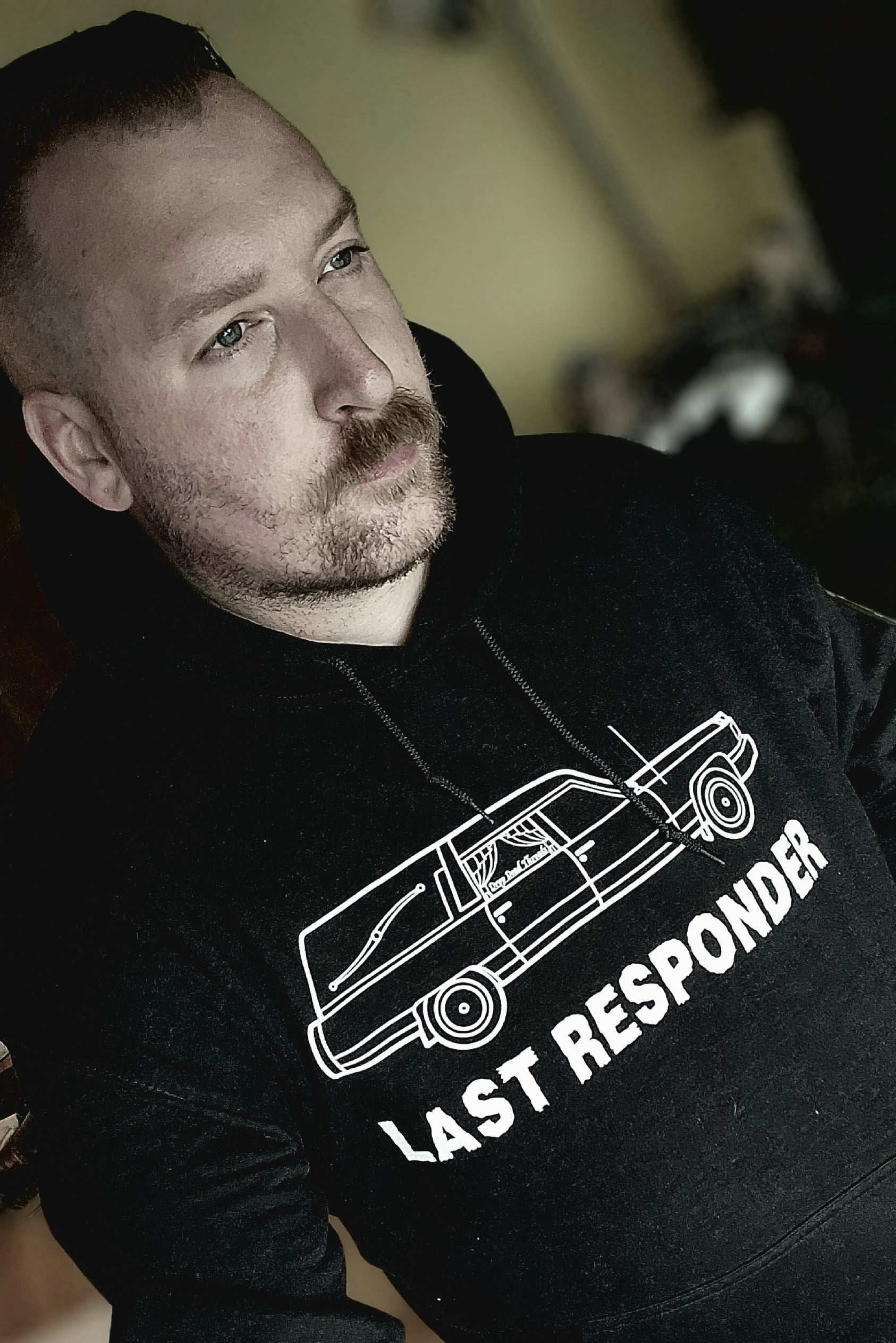 This is our Last Responder hoodie featuring our Hearse Icon Illustration modeled from a 1991 Cadillac Superior Crown Sovereign Hearse